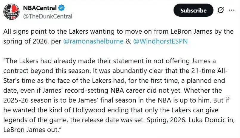 ESPN报道,湖人明确表示不会在2026年夏天,为詹姆斯提供一份续约合同,意味着宣告双方的合作进入了倒计时。